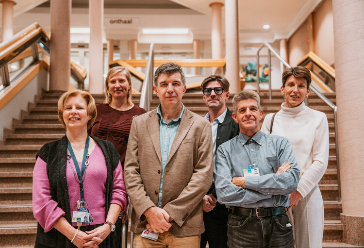 Op de foto vlnr: dr. Véronique Fabré (hoofdarts AZ Sint-Blasius), Josefien Van Laere (hoofdapotheker AZ Sint-Blasius), dr. Stefaan Gouwy (hoofdarts AZORG), dr. Samuel Bral (medisch diensthoofd radiotherapie), Peter Van Puyvelde (waarnemend algemeen directeur AZ Sint-Blasius) en Kathy Van Hecke (directeur-hoofdapotheker AZORG).